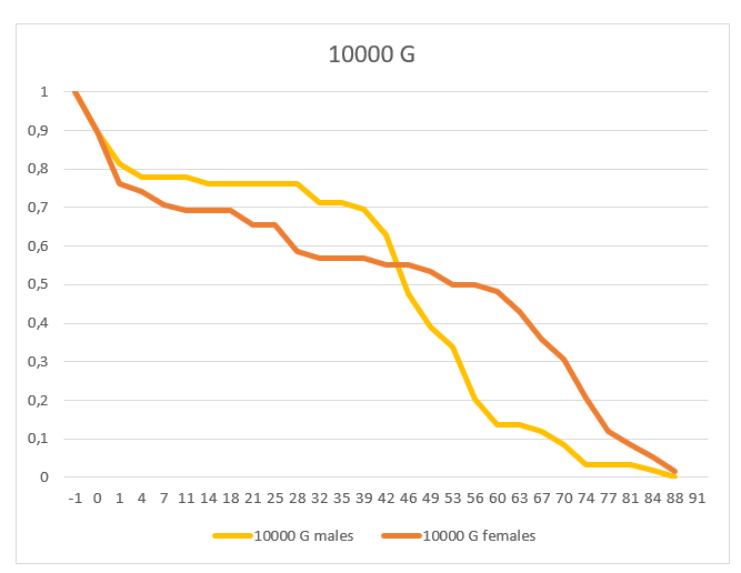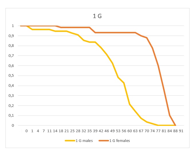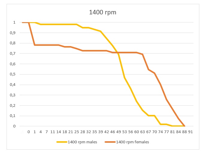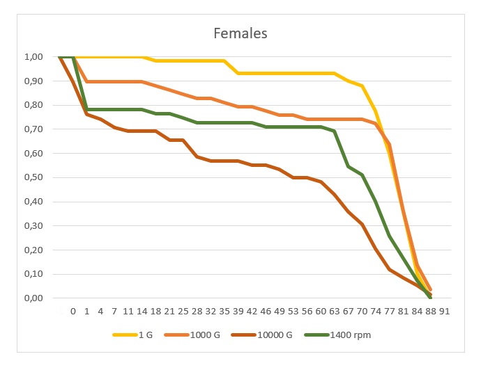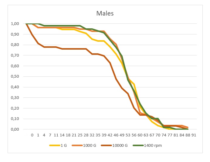 Os testes realizados permitiram retirar conclusões acerca da taxa de sobrevivência destas moscas face a diferentes valores de aceleração e rotação (1G (controlo), 1000G, 10000G e 1400 rpm) e o efeito destas na locomoção das moscas. Os testes realizados tiveram em conta os sexos das moscas (masculino e feminino). No total foram submetidas a teste 480 Drosophilas, 120 (60 de cada sexo) para cada condição de teste. Os seguintes gráficos ilustram os resultados obtidos durante os 91 dias de testes.