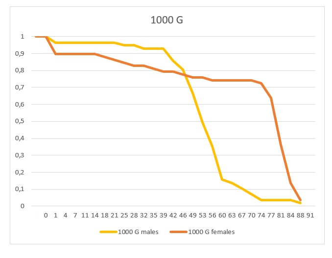 Apenas para forças superiores a 1000G é que as moscas manifestam uma menor taxa de sobrevivência. Nesse sentido, esperamos durante a queda do nosso CanSat uma elevada taxa de sobrevivência destes seres vivos, visto que não se esperam condições tão extremas. A análise dos gráficos também nos permitiram concluir que os machos manifestam uma maior taxa de sobrevivência comparado com as fêmeas.